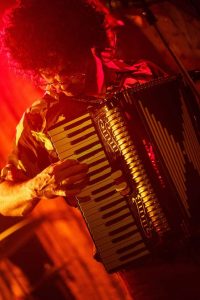 Na foto, o eterno Harry Potter aparece irreconhecível com cabelo cacheado e bigode. Na imagem, ele usa camisa havaiana e óculos de grau e toca acordeom (ou a nossa conhecida sanfona).