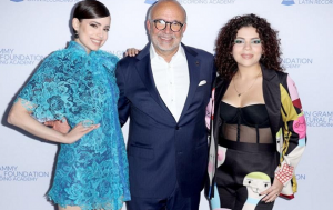 O presidente da Academia Latina da Gravação, Manuel Abud, entre a cantora Sofia Carson, patrocinadora da principal bolsa, e a vencedora da mesma, a venezuelana Valentina García