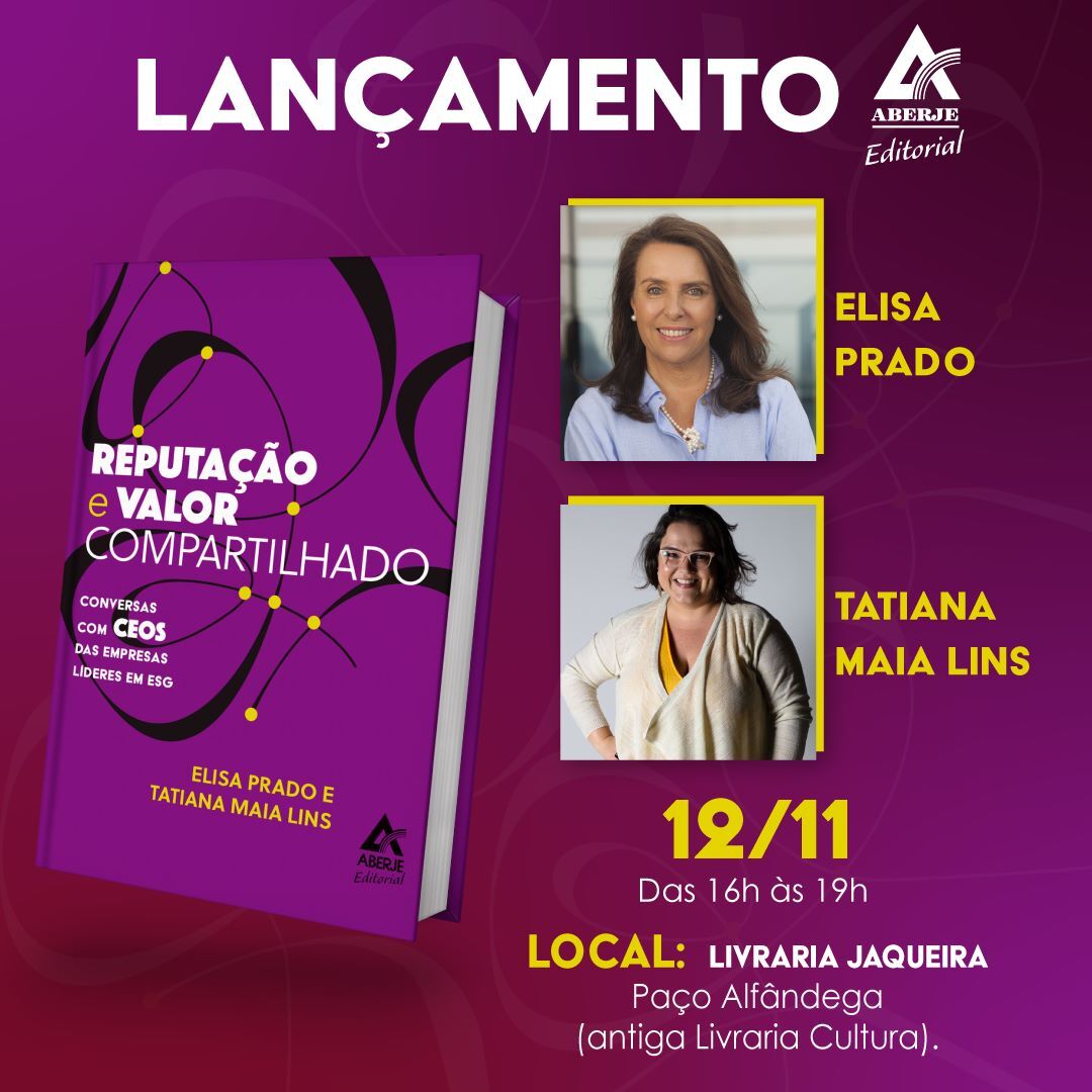 O livro Reputação e Valor Compartilhado – Conversas com CEOs das empresas líderes em ESG, das autoras Tatiana Maia Lins e Elisa Prado, será lançado no Recife neste sábado (12), das 16h às 19h na Livraria Jaqueira do Paço Alfândega.