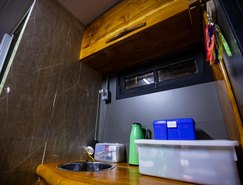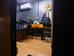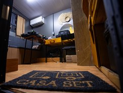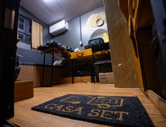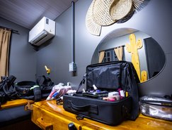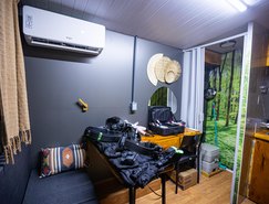 “Passamos seis meses planejando cada centímetro da nossa Casa Set, porque sabíamos que cada espacinho seria importante para o resultado final. Ela possui um banheiro, cozinha, uma bancada retrátil que pode servir para equipes de produção ou camarim, armários para guardar objetos e cabides para deixar figurinos, além de um sofá. Nossa ideia era de conseguirmos dar dois passos dentro do espaço e conseguimos dar três com tranquilidade, o que nos deixou muito feliz”, explica Adriana.