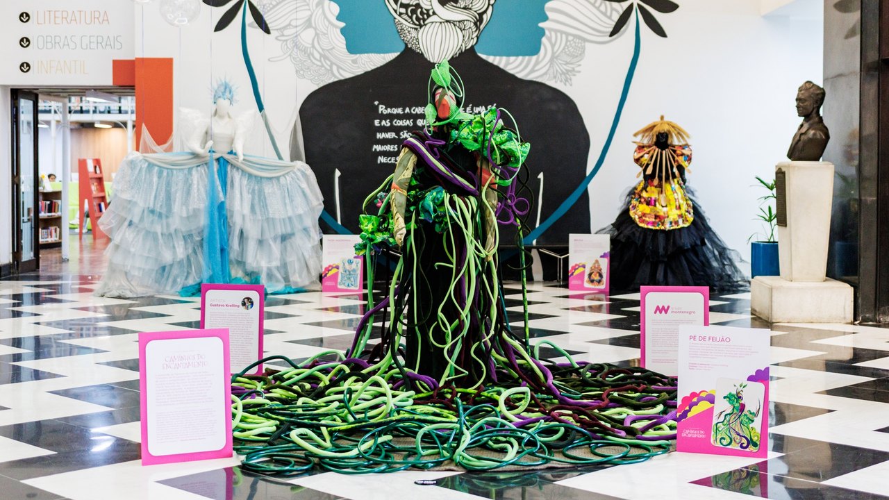 Ao todo, a exposição na Biblioteca Pública do Paraná conta com 10 figurinos expostos: Bruxa (João e Maria), Pé de Feijão, Fada Madrinha (Cinderela), Madrasta (Cinderela), Cinderela, Chapeuzinho Vermelho, Pequena Sereia, Príncipe Encantado, Espantalho (O Mágico de Oz), e Fada Primavera (A Bela Adormecida). Entre os destaques da mostra está o figurino da Pequena Sereia, confeccionado especialmente para a temporada portuguesa, que leva colheres de plástico e garrafas pet; e o Pé de Feijão, feito com mangueiras de jardim, espumas e tubos corrugados pintados, e peneiras de cozinha.