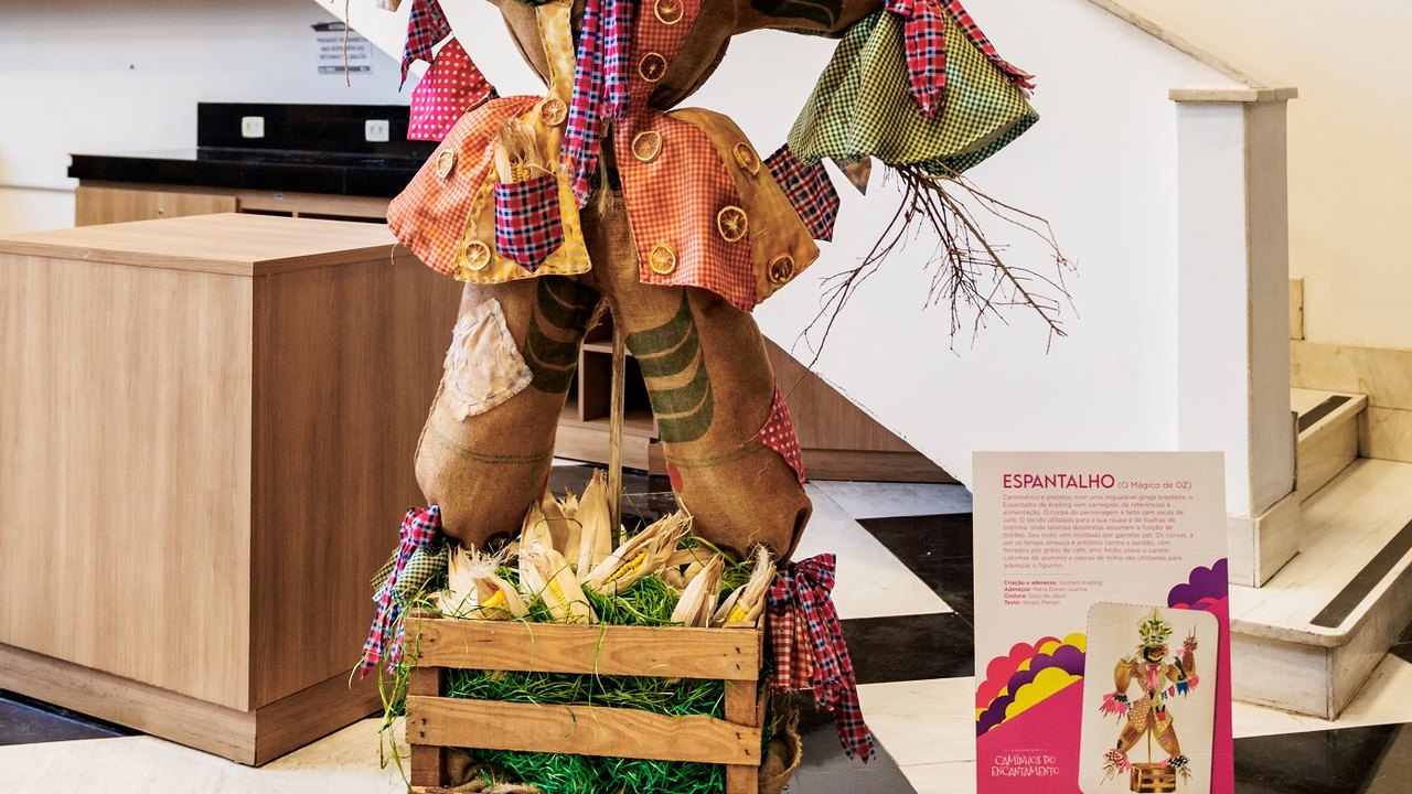 A proposta da exposição “Caminhos do Encantamento”, que faz parte da programação oficial do festival de teatro infantil “Era uma vez, eram duas… Eram três”, é proporcionar uma imersão no universo mágico dos contos de fadas a partir da recriação de figurinos de personagens clássicos da literatura infantil. “As peças dessa exposição são uma grande brincadeira de ressignificação de materiais e uma permissão para invenção de infinitas possibilidades. A Chapeuzinho Vermelho, que vai levar doces na vovozinha – como na canção de Braguinha – aparece com um traje todo feito de embalagens de doces na cor vermelha. A Bruxa, de João e Maria, que atraia as crianças para dentro de sua casa de doces, aparece com um colar feito de colheres de pau, mangas e avental feitos com papel de bala e cabelo de palha de vassoura”, destaca Gustavo Krelling, que desenvolveu as peças em parceria com sua fiel costureira Glaci de Jesus.